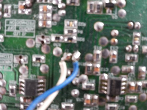 Observe a imagem abaixo, solde dois fios, com cuidado para não curto-circuitar dos terminais do LED, preferencialmente, retire o soldador da tomada para não destruir o passivo com a tensão que “foge” pelo soldador, também deixe o passivo com a alimentação dele desligada.