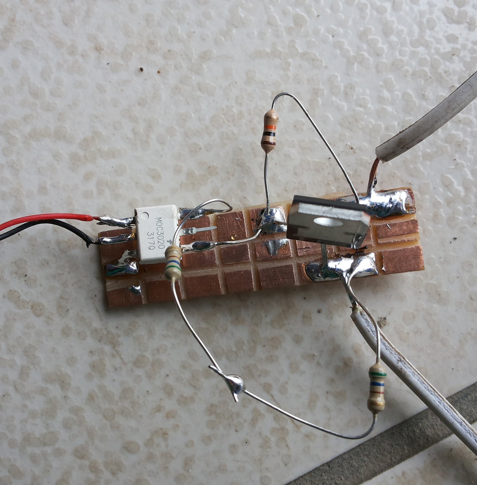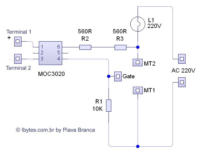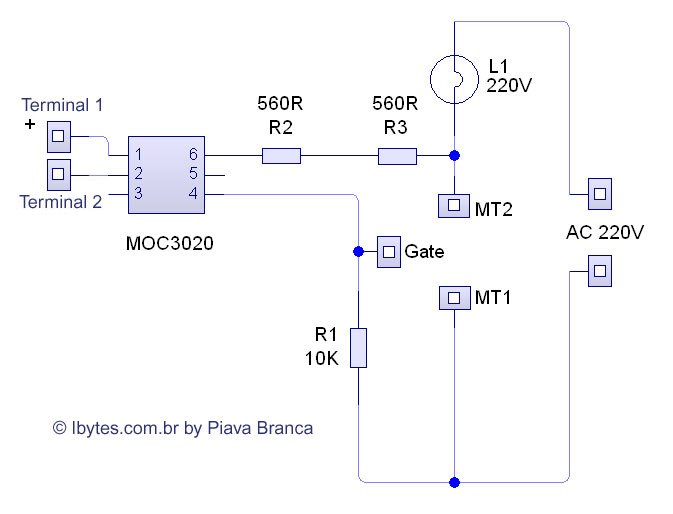 Nesse projeto, pegamos a tensão que alimenta o LED indicador de movimento e aplicamos na entrada de um circuito integrado do tipo MOC3020, que é um acoplador óptico, composto por um LED e um DIAC.