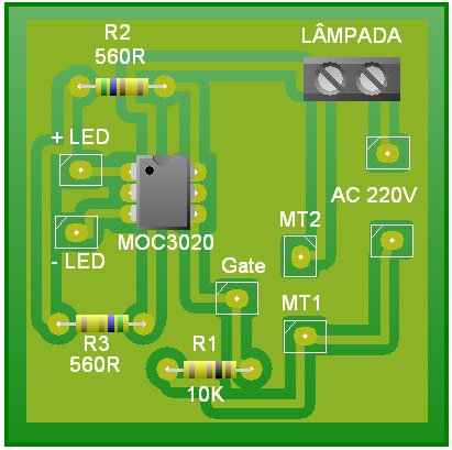Apesar do custo não ser assim tão barato, o CI MOC3020 isola o circuito de baixa tensão do circuito de alta tensão, que é o circuito que faz acender a lâmpada cada vez que o sensor detectar um movimento.